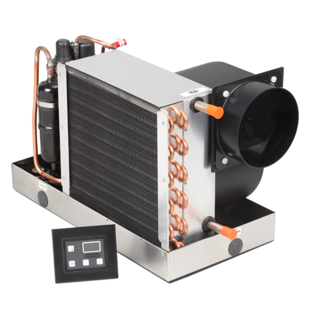 Self-contained air conditioning kits. Offering cooling or heating in 6,000, 10,000 and 16,000 BTU/hr capacities, ECD Kits contain all components for a complete A/C system. All units have high-velocity blowers with internal motors for a more compact installation footprint. The blower can be rotated to a horizontal or vertical position for greater installation flexibility. Units are built on an easy-to-plumb stainless-steel drain pan, and the pre-installed return-air filter is removable for cleaning. ECD units are operated by a compact digital control/display (included) that features a bright green LED and large buttons.