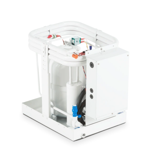 This condenser has reversing valve, pressure switches, and service ports centrally located for easy maintenance access from any side. Vibration-isolating compressor mounting system reduces noise and vibration. Pair this with a Dometic Emerald TurboVap R-410A evaporator.